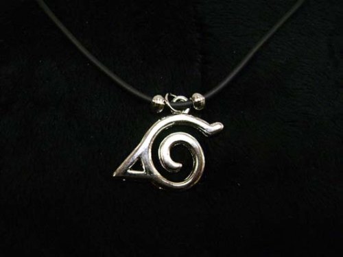 This is a necklace from the popular anime and manga series, Naruto. The necklace's silver color pendent features the Hidden Leaf Village's symbol. The necklace with its black plastic band is approx. 9" in length.