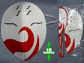 This mask made to look like Haku Anbu mask from Naruto. The mask is made of felt and covered with plastic with the designs from Haku mask on it. The mask attaches to your head by an elastic strap around the sides the strap will stretch to fit any size head. This mask has no eye holes or slits to see through.