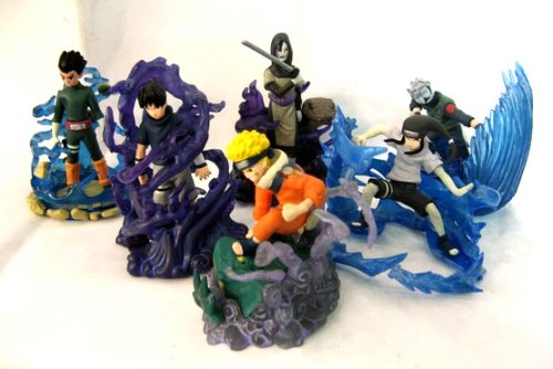 This is a 6 piece figure set from the popular anime and manga series, Naurto. The set features the popular characters Rock Lee, Sasuke Uchiha, Naruto Uzumaki, Orochimaru, Neji and Kakashiand Naruto from the new Shippuden series. The sizes of each figure is around 3.5 - 4 inches Tall. Please note, this set of figures comes in unassembled and require you to put the pieces together. Like most Japanese trading figure, there is no clear step by step instruction to assemble the figure. But they are not very hard to put together. Just think of it as a figure puzzle. You'll accomplishment when you complete the whole set with your own hands ^_^