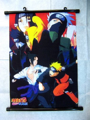 This wallscroll features several of your favorite characters from the popular manga and anime series, Naruto! This wallscroll features Sasuke and Naruto in a fight from the 2nd season of Naruto, Shippuden. Also featured are the Akatsuki members, Itachi Uchiha, Kisame Hoshigaki, and Deidara as well as Team 7 members, Kakashi Hatake and Sakura Haruno. The characters are shown against a red background. This is a small sized wallscroll. The wallscroll contains two hooks that enables you to hang it from any wall (using nails/push pins, etc.). This wallscroll is 33cm (13-inches) wide, and 46cm (18-inches)long.