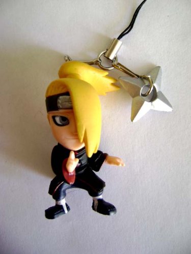 This is a cell phone charm from the hit anime and manga series, Naruto! This cell phone charm is featuring the popular Akatsuki member, Deidara! Asides from just having Deidara, this charm also comes with a mini charm of the of a ninja's shiriken! The charm figure itself is approximately 1.5-2 inches, while the strap to attach to your cell phone is approximately 1.5-2 inches long. This charm is great to show off your fandom for the series and also great to keep your cellphone company!