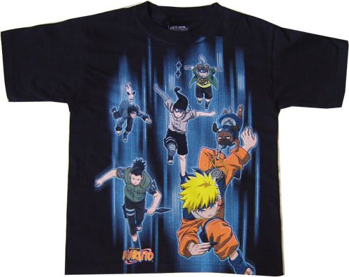 The awesome licensed Naruto anime shirt features Sasuke Retrieval Team, Naruto, Pakkun, Kiba with Akamaru, Neji, Choji, and Shikamaru . YOUTH size. Manufacturer's suggested age for this tee shirt is 6-20.