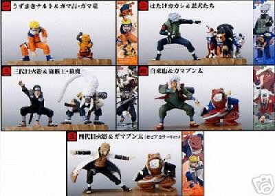 This is the Kuchiyose no Zyutsu trading figure series from the popular anime series, Naruto. This set contains the following characters along with their summons: 1. Naruto along with Gamatatsu & Gamakichi (Red and yellow toads) 2. Kakshi along with Ninken