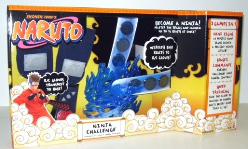 The Naruto Ninja Challenge is a game where players try to master a series of hand gestures in order to control the flow of plastic poker chip-like disks flying out of a wireless base unit. It's based on a popular Japanese comic book and cartoon series. The game comes with two gloves, though only one has sensors, two of which are located in the top of the glove and the other two are located in the palm. By touching these sensors with your other hand or against your body and building these gestures into combinations, the voice box on the glove with congratulate or admonish you. The glove communicates wirelessly to the base and so directs its movement. Get the hand signs right and the base will launch the discs around the room. If you get the sequences wrong, however, the base will turn and launch discs in your direction. Either way, you're going to be picking up a lot of these little disks. The games included are skill-level variations on making combinations during a time limit and executing specific combinations called out by the voice box. There's a bit of light assembly at the beginning and a test routine to make sure the glove is properly communicating with the base. We found it difficult to keep them in communication. This game will likely only be fun for devoted Naruto fans. It's powered by four AAA-size batteries in the glove and four AA-size batteries in the base, which are not included. Inside the box you'll find the base, a pedestal, four sheets of ice flames, two gloves and 30 disks. --Porter B. Hall