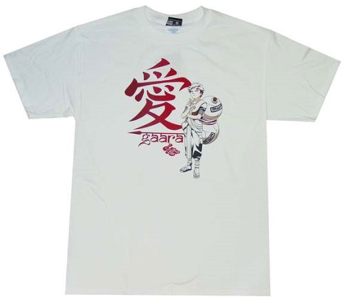 This cool t-shirt features Gaara from the hit anime Naruto. Gaara, whose name means "A demon who loves only himself," is one of the strongest and most mysterious students of the Hidden Village of Sand. He manipulates sand from the large gourd that he carries, which has a seemingly endless supply of sand, in order to mercilessly defeat his opponents. On his forehead (and beside him on this shirt) is the Japanese kanji for "love." Standard mens size tee. Shoulder-to-shoulder taped, sleeve and bottom hem are double-needled. 100% cotton. Officially licensed.