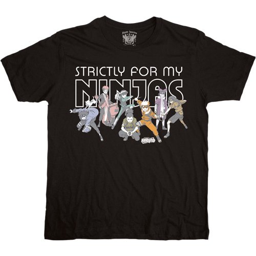 Strictly For My Ninjas. This awesome Naruto shirt features all your favorite ninjas from the show. Includes Naruto, Rock Lee, Gaara, Kiba, Shikamaru, and more. Standard mens size tee. Shoulder-to-shoulder taped, sleeve and bottom hem are double-needled. 100% cotton. Officially licensed.
