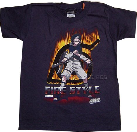 Licensed Naruto anime t-shirt featuring Sasuke Uchiha. Sasuke FIRE STYLE features a buring Leaf Village Logo. Front image. Youth size.