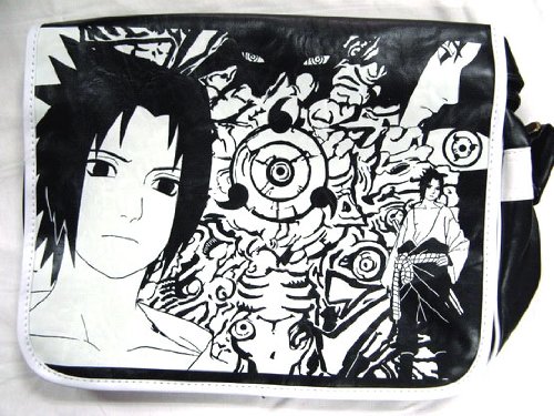Naruto anime/manga Series Messenger Bag with the main character Sasuke! The front of the messager bag features Sasuke as he appears in the Shippuden arc of the series and a series of images of his Sharingan power! The bag has a mid sized zipper pocket on the back, and on the inside. There is also a large pocket on the inside. The bag also has velcro to keep shut.