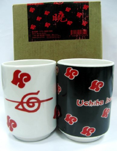 This is a great collectible for fans of the Naruto anime and manga series! This set features the popular character, Uchiha Itachi! Itachi was once a Konoha Ninja, but is now a member of the Banished Ninja Organization inchesAkatsuki inches This is a 2 piece glass tea cup set: 1. White cup with Red Clouds design - A side: Banished Konoha ninja symbol in red. B side: Japanese kanji for inchesAkatsuki inches, literally inchesDawn inches in red. 2. Black cup with Red Clouds design - A side: inchesUchiha Itachi inches in red. B side: Itachi hidden under his black Akatsuki coat. Each cup is about 3.5-inches tall and 2.5-inches wide. These are great for display and use. Enjoy your tea or other drinks with these Itachi Tea Cups!