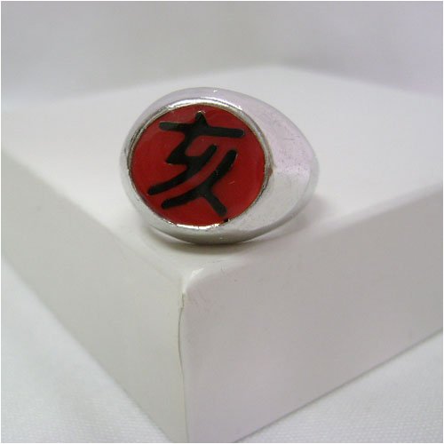 This is a ring from the hit anime and manga series, Naruto! This ring style is worn by the popular villain organization, the Akatsuki. The popular character, Zetsu wears this ring. This ring is red, bearing the Gai (boar) kanji symbol in black. The band is silver-colored. The size of this ring varies, being from an approximate ring size 7.5-8.