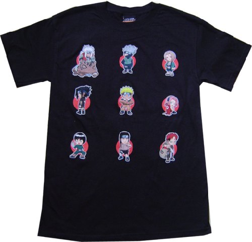 Licensed Naruto anime shirt featuring Jiraiya with Gamabunta, Kakashi, Tsunade, Sasuke, Naruto, Sakura, Rock Lee, Neiji, and Gaara in super deformed style. Adult size.