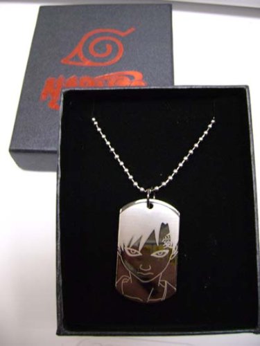 This is a silver color dog tag from the popular anime and manga series, Naruto. This dog tag features the popular character Gaara. The dog tag has a sketched out figure of Gaara upon it. The dog tag comes with a ball chain that is approx. 10" and along with the dog tag, the total size of the necklace would be approx. 11"