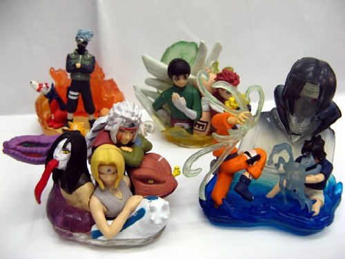 This is a 4 piece emaki figure set from the popular anime and manga series, Naruto! An emaki figure not only puts a character on display, it sets them in a scene that tells a story. This set features several prominent Naruto characters as they would appear at the end of the original Konoha arc of the series. The figures are: 1. Tsunade, Jiraya, and Orochimaru, 2. Gaara and Rock Lee, 3. Kakashi and his ninja dogs, 4. Naruto, Sasuke, and Itachi. Each emaki figure stands about 3 inches tall. It is a great set for any fan of the series to set in a display case, on a desk, or even next to your computer monitor.