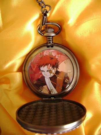 This is a pocket watch from the popular anime/manga series, Naruto! This pocket watch features the popular character Gaara as he appears in the Shippuden arc of the series! The image on the face of the watch is the same as it appears on the front. The numbers and hands of the watch are gold, and the watch itself is in a dark silver color. The chain and clip measures approximately 15 inches, and the watch is approximately 3 inches long.
